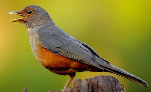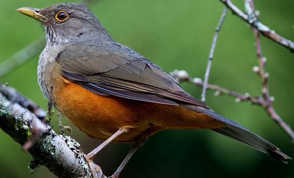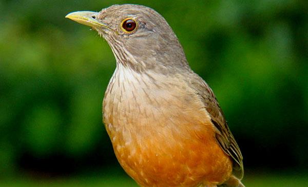 棕腹鶇:別名,為雀形目、鹟科、鶇屬鳥類,原產(chǎn)于南美洲阿根廷、玻利維亞、巴西、巴拉圭、烏拉圭,棲息于樹木繁茂地區(qū)、次生林、森林邊緣、灌叢、稀樹草原,也出現(xiàn)在農(nóng)耕區(qū)、村莊、空曠地、公園、花園,包括城市所在的市區(qū)和郊區(qū)的草坪上。在干旱地區(qū),活動(dòng)局限于水源附近。在玻利維亞從海平面到海拔2200米,在巴西南部可以上達(dá)海拔2600米的高度。1818年命名,共2個(gè)亞種。