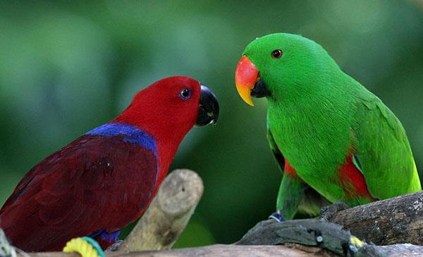 雌雄顏色反差極大,是兩性差異最明顯的鳥類之一。雌鳥鮮紅色的羽色與雄鳥亮眼的綠色形成強烈對比,非常美麗吸引人,是比較常見的中大型籠養(yǎng)鸚鵡,且比其他鸚鵡種類安靜一些,但有時仍會嘶叫吵雜,尤其在傍晚。