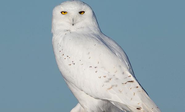 雪鸮:別名雪梟_白鸮_雪鷹_白貓頭鷹,為鸮形目、鴟鸮科、雕鸮屬鳥(niǎo)類(lèi),原產(chǎn)于北美洲、亞洲西北部,包括加拿大、美國(guó)、芬蘭、格陵蘭、冰島、挪威、俄羅斯、瑞典等國(guó)。夏季主要棲息于北極的凍原帶、凍原苔原丘陵、海岸和鄰近荒原與沼澤等,冬季則主要棲于苔原森林、平原、曠野和森林中,特別是開(kāi)闊的疏林地帶,也曾見(jiàn)于海拔3000米以上的針葉林帶。1758年命名,無(wú)亞種。冬候鳥(niǎo),雌鳥(niǎo)會(huì)定居一處并劃分地盤(pán),而且會(huì)保衛(wèi)領(lǐng)地,阻止外來(lái)者入侵,直到春天它們才會(huì)離開(kāi)此地向北遷徙。