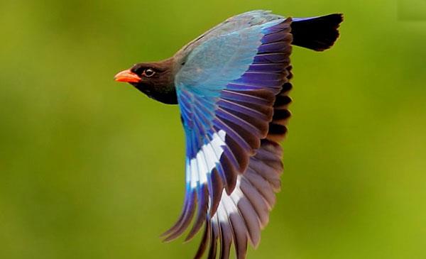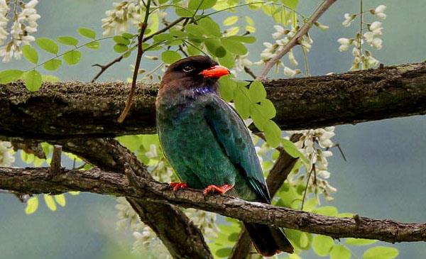 頭體長(zhǎng)26-29cm,重107-194g。通體藍(lán)綠,頭大而寬闊,頭頂扁平。頭至頸黑褐色,后頸、上背、肩、下背、腰和尾上覆羽暗銅綠色。頭和翅較暗,呈黑褐色,初級(jí)飛羽基部具淡藍(lán)色斑,飛翔時(shí)甚明顯。虹膜暗褐色,嘴、腳紅色。常長(zhǎng)時(shí)間地站在林緣路邊高大喬木頂端枯枝上,或在空中成圈飛翔和上下飛翔,邊飛邊“嘎嘎”地鳴叫。兩翅覆羽與背相似,但較背鮮亮而多藍(lán)色。虹膜暗褐色,嘴朱紅色,上嘴先端黑色,腳、趾朱紅色,爪黑色。因其頭和嘴使它看似猛禽,有時(shí)會(huì)遭成群小鳥的圍攻。