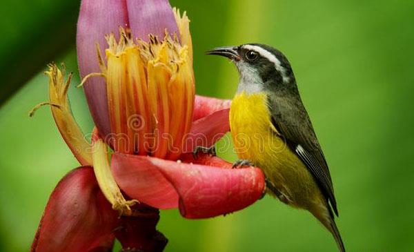 曲嘴森鶯:別名蕉森鶯,為雀形目、森鶯科、森鶯屬鳥類,原產于南美洲波多黎各等國,分布區(qū)域較廣泛,從中北美及南美洲都有它們的身影,在美國的佛羅里達州卻較少能見到。