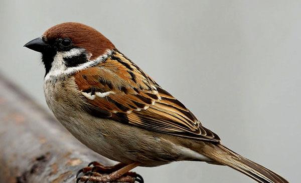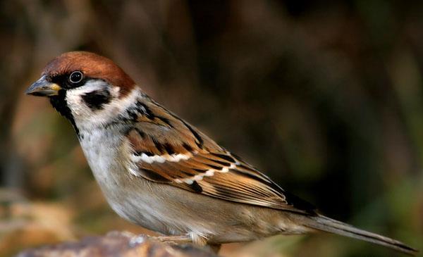 頭體長(zhǎng)12-15cm,重14-24g。額、頭頂至后頸栗褐色,頭側(cè)白色,耳部有一黑斑,在白色的頭側(cè)極為醒目。背沙褐或棕褐色具黑色縱紋。頦、喉黑色,其余下體污灰白色微沾褐色。翅上有兩道顯著的近白色橫斑紋。虹膜暗紅褐色,嘴一般為黑色,但冬季有的呈角褐。腳和趾等均污黃褐色。鳴聲極噪雜,略似zek-zek-chi。平時(shí)總是三五只或更多的群集,嘰嘰喳喳叫得不休,特別是集大群時(shí),百米以?xún)?nèi)均可聽(tīng)到。