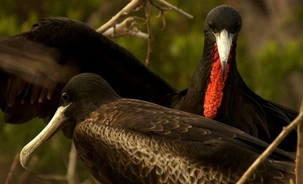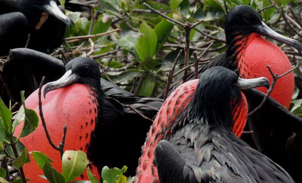 喜歡群居,棲息時,大群的軍艦鳥擠在一起,顯得十分擁擠。它白天常在海面上巡飛遨游,窺伺水中食物。一旦發(fā)現(xiàn)海面有魚出現(xiàn),就迅速從天而降,準確無誤地抓獲水中的獵物。軍艦鳥羽毛沒有油,不能沾水,否則就會淹死,大部分時間都在空中飛翔的。因此它們只能是少量捕一些靠近水面的魚,大部分是憑著高超的飛行技能,從空中截奪其它鳥捕的魚。