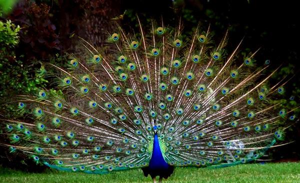 頭體長(zhǎng)90-230cm,翼展130-160cm,重4-6kg。雄性體的頸部、胸部和腹部呈燦爛的藍(lán)色,羽光彩熠熠,身披翠綠色,下背閃耀紫銅色光澤,覆尾羽20枚,長(zhǎng)1米以上,可以豎起來(lái)像一把扇子一樣開(kāi)屏。藍(lán)孔雀羽片上綴有眼狀斑,這種眼狀斑是由紫、藍(lán)、黃、紅等構(gòu)成。開(kāi)屏?xí)r光彩奪目,抖動(dòng)時(shí)能發(fā)出沙沙聲。尾羽上反光的藍(lán)色“眼睛”可用來(lái)嚇退天敵。雌性也容易受“眼睛”多的雄鳥(niǎo)的吸引。