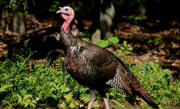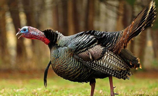 體長(zhǎng)110-115cm。翼展125-144cm,重2.5-11kg。辨識(shí)度極高。嘴強(qiáng)大稍曲。頭頸幾乎裸出,僅有稀疏羽毛,并著生紅色肉瘤,喉下垂有紅色肉瓣。背稍隆起。體羽呈金屬褐色或綠色,散布黑色橫斑。兩翅有白斑,尾羽褐或灰,具斑駁,末端稍圓。腳和趾強(qiáng)大,有兩指,爪甲鋒利,能傷人至死。墨西哥的普通火雞亞種與美國(guó)東南和西南部的普通火雞在羽毛斑點(diǎn)和腰部顏色上稍有差別,但羽衣基本上均為黑色,并帶有虹彩光澤的青銅色和綠色。
