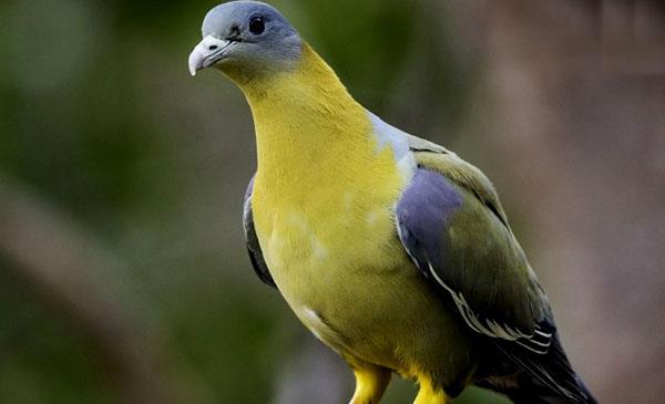 頭體長(zhǎng)27-34cm,重230-300g。雄鳥額部、眼先、頦部、喉部以及前頸等均為黃綠色,頭、頸的其余部分為灰色,頸背處有一條寬闊的檸檬黃色橫帶向兩側(cè)擴(kuò)展到整個(gè)上胸部,其后緊接著一條淡紫藍(lán)灰色的橫帶,同樣向兩側(cè)延伸向下,并且與下胸部和腹部的大塊藍(lán)灰色相融為一體。下胸部和腹部為淡藍(lán)灰色,與其他綠鳩類明顯不同,肛周及覆腿羽為亮黃色而雜有白色。尾上偏綠,具寬大的深灰色端斑。虹膜的外圈為玫瑰紅色,內(nèi)圈為藍(lán)色。