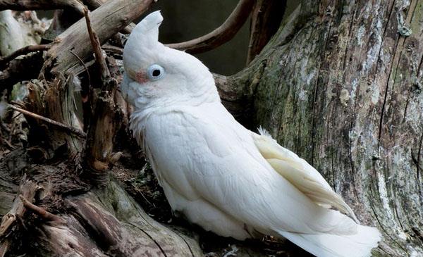 頭體長(zhǎng)30-34cm。體型很小,羽色純白透出些許的粉色。眼先有一塊清晰的粉紅色板塊,臉頰和耳覆羽透出淡黃色的色彩。翅膀和尾巴下,有內(nèi)螺紋黃色。喙是灰白色。眼圈偏藍(lán)的白色。虹膜為褐色,腳黑灰色。特點(diǎn)是嘴粗厚而強(qiáng)壯,上嘴向下鉤曲,兩側(cè)的邊緣有缺刻,基部具蠟?zāi)ぁI献炫c頭骨的連接猶如絞鏈一樣,能活動(dòng)自如。翅形稍尖,腿短健,腳上有四趾,前后各有兩趾,稱為對(duì)趾型,爪尖銳而彎曲,適于攀樹。