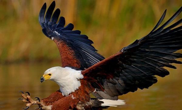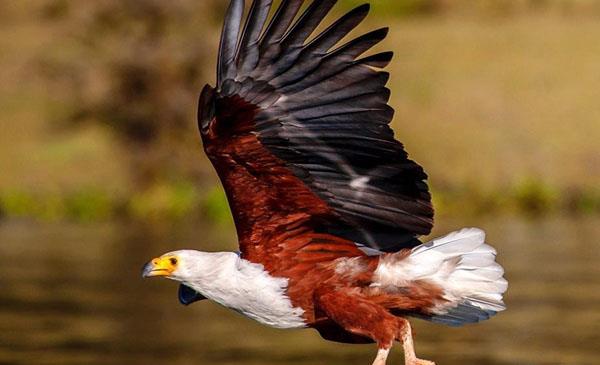 贊比亞、南蘇丹、津巴布韋國(guó)鳥,外型獨(dú)特,有白頭海雕有些相似,但其頭部向下的白色羽毛面積更大,體形也略小一些。在高出觀察到魚后,就會(huì)突然向下俯沖,在水面伸出爪子,把魚抓牢,再拉出水面,帶回棲息的樹上進(jìn)食。