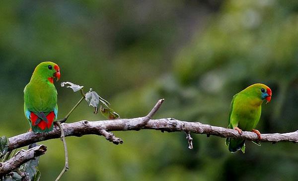 菲律賓短尾鸚鵡:別名懸吊鸚鵡_菲律賓懸掛鸚鵡_菲律賓懸吊鸚鵡,為鸚形目、鸚鵡科、短尾鸚鵡屬鳥類,原產(chǎn)于亞洲菲律賓附近棉蘭老島、蘇祿群島、錫布延島、宿霧島、巴西蘭島等島嶼。主要棲息于海拔1300以下的森林邊緣、樹木繁茂的地區(qū)、次生林、果園和椰子種植園。也出現(xiàn)于村莊附近的竹林和耕地的灌木叢。有些亞種在高達海拔2500m的地區(qū)也可見到。多在茂密的樹冠頂層活動,但有時為了尋找合適的食物,也下降到較低的地方。1776年命名,共10個亞種。
