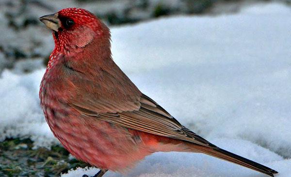 科威特國(guó)鳥,為雀科體形較大,不常見(jiàn)的留鳥。體羽深紅色,羽中央具白色或帶粉白色斑點(diǎn),頰深紅色。雄性成鳥頭部、頦至上胸光亮洋紅色,除眼先和眼周外均具白色光澤斑點(diǎn),頰及耳羽亮粉紅色。