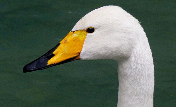 頭體長120-160cm,翼展218-243cm,重8-12kg,虹膜暗褐色,嘴黑色,上嘴基部黃色,此黃斑沿兩側(cè)向前延伸至鼻孔之下,形成一喇叭形。嘴端黑色。跗蹠、蹼、爪亦為黑色。游水時頸較疣鼻天鵝為直。