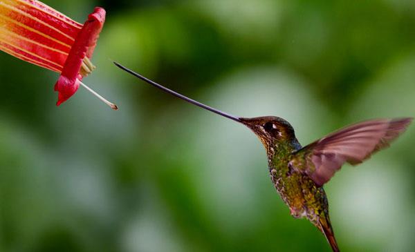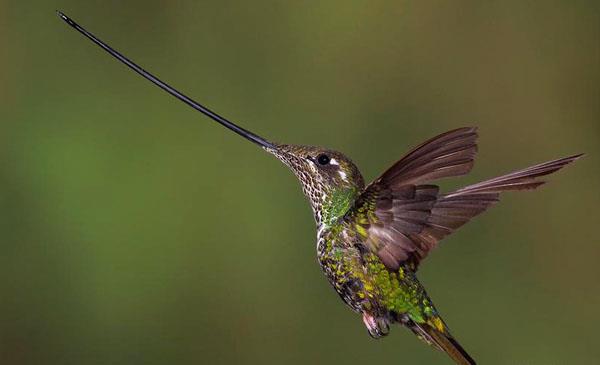 最大的蜂鳥品種之一,也是本屬唯一物種,擁有一只冠絕千萬鳥類的大長喙,里面蘊含著更長的舌頭,能以13次/秒的速度高效吸食花蜜。按身體比例計算,它的鳥喙是所有鳥類中最長的,是為了適應當?shù)鼗ü跇O長的蜜源植物進化而來。