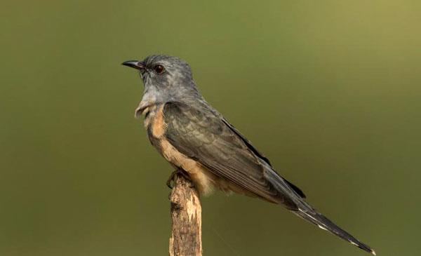 體長(zhǎng)21-25cm,重23-35g。雄鳥頭、頸和上胸灰色,背至尾上覆羽暗灰褐色。肩和兩翅表面褐色而具青銅色反光。翼緣白色。外側(cè)翼上覆羽雜以白色橫斑。尾淡黑色,具白色端斑。下胸以下及翼下覆羽淡棕栗色。虹膜紅褐色,雌鳥圍以灰色和黃色。嘴褐色(冬季)或角褐色,下嘴基部橙色(夏季)。腳黃色,雌鳥深黃色。相似種棕腹杜鵑體型較大,尾具黑色橫斑和紅褐色端斑,胸、腹棕栗色,腹以下白色,區(qū)別甚明顯,野外不難辨別。