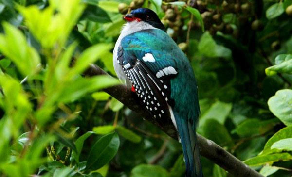 斑尾非洲咬鵑:別名斑尾咬鵑,為咬鵑目、咬鵑科、非洲咬鵑屬鳥類,原產(chǎn)于非洲馬拉維、安哥拉、布隆迪、喀麥隆、剛果、肯尼亞、莫桑比克、尼日利亞,盧旺達(dá)等國(guó)。棲息于海拔1600以下的森林,較綠頰咬鵑所處環(huán)境高一些,但也有重疊的地方。1882年命名,無(wú)亞種。