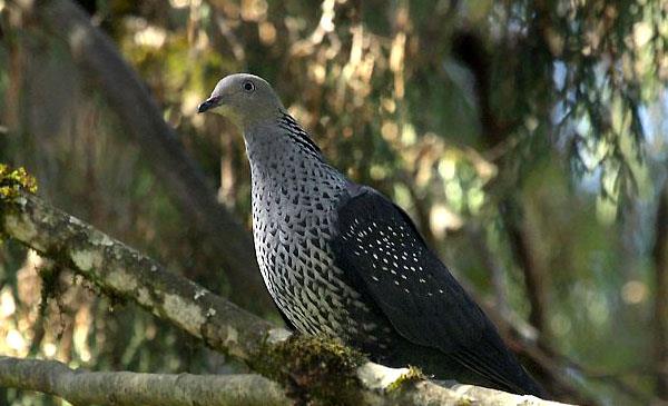 頭體長(zhǎng)34-39cm。與其他所有鴿種的區(qū)別在頸部羽毛形長(zhǎng)而具端環(huán),體羽無(wú)金屬光澤。頭灰,上背紫醬色,下背灰色。虹膜灰白,嘴黑色,嘴基紫色。腳黃綠色,爪艷黃色。被列入《世界自然保護(hù)聯(lián)盟》(IUCN)ver3.1:2010年鳥(niǎo)類紅色名錄。