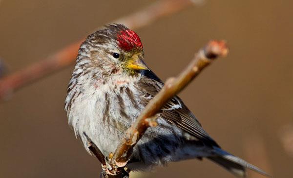 體型與麻雀相仿,額和頭頂?shù)纳罴t色斑紋及黃白色眉紋是其重要特征。性不畏人,取食或選擇巢對(duì)時(shí),人距它很近時(shí)方飛去。常一鳥(niǎo)先飛,群鳥(niǎo)隨而緊跟。遷徙期常能見(jiàn)到數(shù)十只甚至上百只的大群。