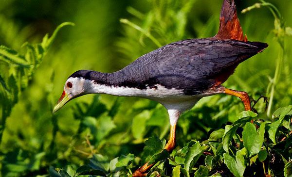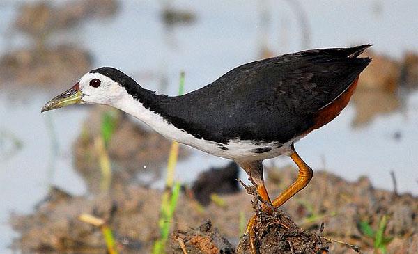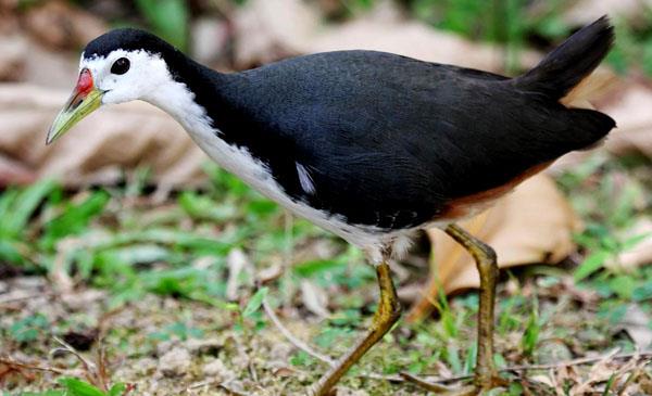 頭體長(zhǎng)27-35cm,重163-258g。嘴油綠色,嘴基部紅色。跗蹠、趾及爪淺黃色。頸側(cè)、上體石板灰色。前額、眼先、耳羽、頦、喉至上肢中央均白色,與背部形成黑白分明的對(duì)照。下腹中央白而稍沾紅褐色。腰側(cè)及尾下覆羽紅褐色。下腹和尾下覆羽栗紅色。虹膜紅色。嘴黃綠色,上嘴基部橙紅色。腿、腳黃褐色。善于步行、奔跑及涉水,行走時(shí)頭頸前后伸縮,尾上下擺動(dòng)。