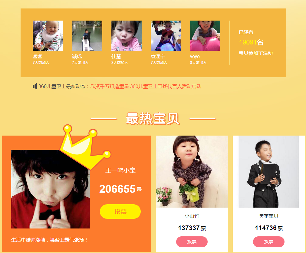 那么,我們在做活動的事情就必須要讓他們可以更方便、更全面、更有底氣的去展示她孩子最好的一面。于是,我們在本次“360兒童衛(wèi)士尋找代言人”活動中,家長們可以上傳自家孩子最好看的3張照片讓所有人觀賞,同時通過排名的方式讓她們與全中國的孩子們進行一次比賽,爭取360兒童衛(wèi)士代言人的殊榮。也就是說,本次活動我們不僅可以讓他們盡情的向身邊的朋友展示自己的孩子,同時也通過本次活動也給了他們一次可以讓孩子出名的機會,這讓望子成龍的家長們怎么能不爭先恐后的參加活動那?