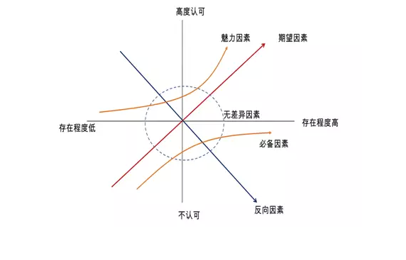 根據(jù)日本教授狩野紀昭(Noriaki Kano)構(gòu)建出的kano模型,影響用戶滿意度的因素化為5個類型: