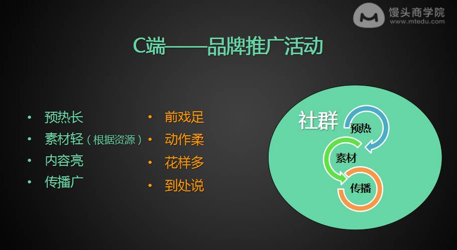 如果做活動(dòng),基本上就是這幾條鐵律。其中,素材是否輕,如何對(duì)資源進(jìn)行分配是非常重要的一件事。以饅頭商學(xué)院為例,他們?cè)趺醋鲈诰€教育?以線上的微課起步,進(jìn)行拉新和品牌的曝光。后來(lái)開(kāi)始做小規(guī)模的線下課程,在積累了一定的經(jīng)驗(yàn),團(tuán)隊(duì)也經(jīng)過(guò)多次磨礪后開(kāi)始組織這種幾百人的大課。這也是循序漸進(jìn)的過(guò)程。跟你團(tuán)隊(duì)的打磨,積累以及手頭上現(xiàn)金的寬裕程度是直接相關(guān)的。