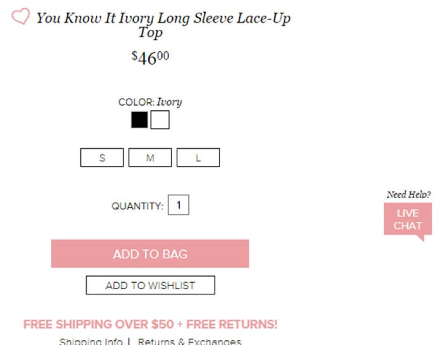 時(shí)尚品牌Lulu的網(wǎng)站為我們提供了另一個(gè)很好的例子,闡釋了“添加到購(gòu)物袋”按鈕在產(chǎn)品頁(yè)面如何有效地用來(lái)驅(qū)動(dòng)銷售。網(wǎng)站的主色調(diào)為黑色,但是如果你聚焦在添加到購(gòu)物袋按鈕,你將會(huì)發(fā)現(xiàn)它很顯眼,因?yàn)樗欠凵摹?/span>