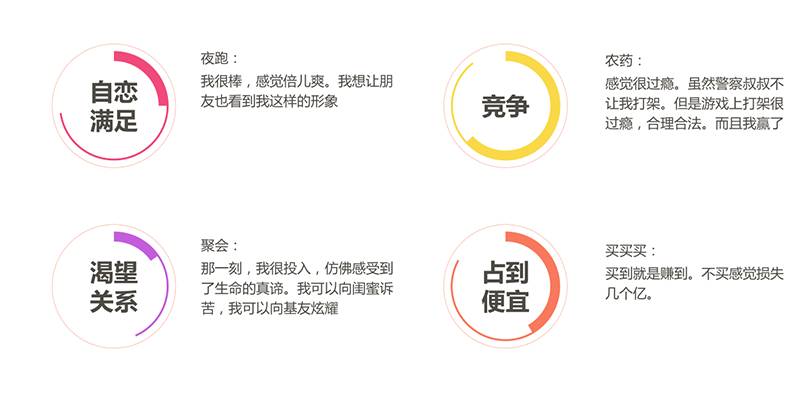 從夜跑中,我們可以給到用戶自戀滿足的感覺,什么叫自戀滿足呢?“自戀”這個詞并不是貶義詞,從心理學上看它更像是一個中性詞,甚至是褒義詞。因為如果沒有自戀,就沒有今天這個社會。每個人或多或少都會自戀,但如果自戀過度別人就會覺得你是蛇精病。之前有個小伙因違規(guī)被交警扣車,那小伙說自己是銀河系的富二代,如果交警敢扣車,就要毀滅地球,這就屬于過度自戀。