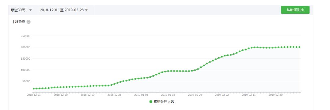 我們先來(lái)看下公眾號(hào)后臺(tái)的漲粉數(shù)據(jù),這是2018年12月1日至2019年2月28日期間的累積關(guān)注人數(shù)折線圖,3個(gè)月時(shí)間,漲粉近20萬(wàn)。