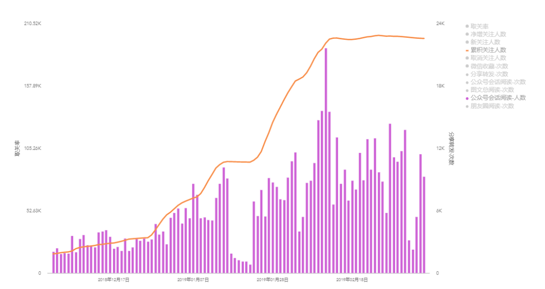 (公眾號(hào)會(huì)話打開(kāi)人數(shù),柱狀圖是公眾號(hào)會(huì)話人數(shù),線條是累積關(guān)注人數(shù))