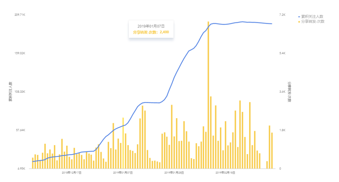 (賬號(hào)分享數(shù)據(jù)圖,柱狀圖是分享轉(zhuǎn)發(fā)次數(shù),線條是累積關(guān)注人數(shù))