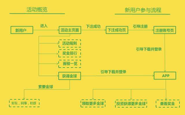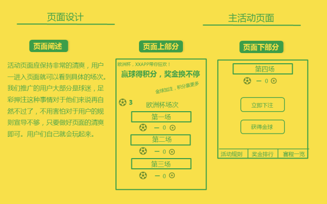 本活動(dòng),采用“雙層結(jié)構(gòu)”設(shè)計(jì),一層是普通的球賽押注,另一層呢就是起到增加活動(dòng)興趣,以及間接引導(dǎo)注冊(cè),下載以及投標(biāo)的“金球”元素。