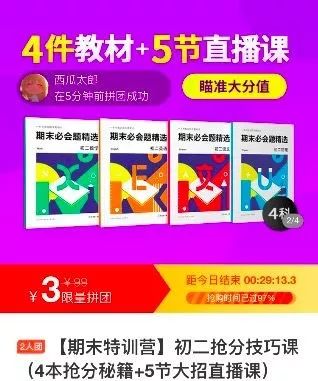低價(jià)拼團(tuán):幾個(gè)人以同樣價(jià)格組團(tuán)購(gòu)買引流課,多用于平臺(tái)展示的課程,比如作業(yè)幫推出的期末特訓(xùn)營(yíng)。