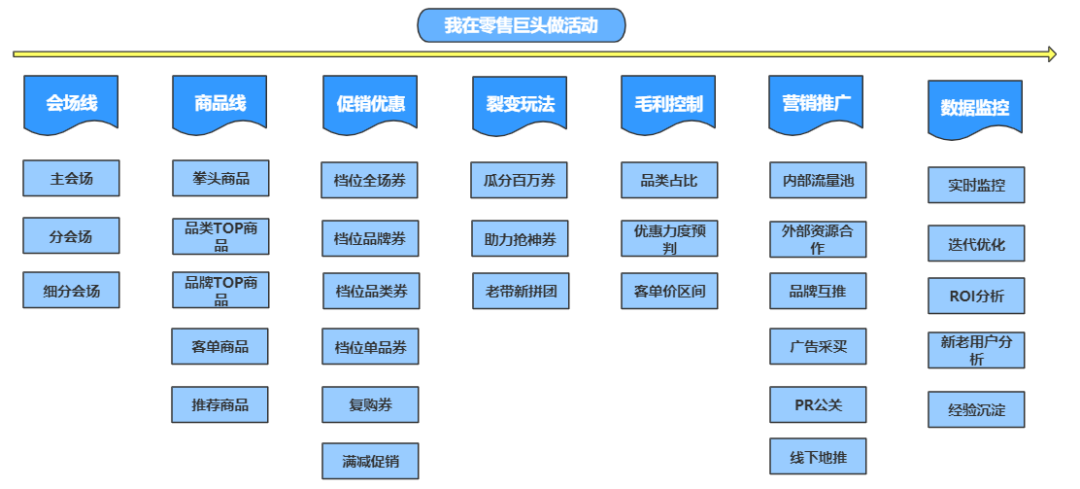 新零售業(yè)務(wù)平臺的運(yùn)營同樣是多元的,但核心的商品/品牌/品類/單品是不可或缺也是舉足輕重的一部分,所有的活動排布需要滿足平臺運(yùn)營策略,拳頭商品/重點(diǎn)品牌/品類/單品等等