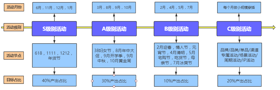 高密度的活動排布下,務(wù)必需要對活動進(jìn)行分檔區(qū)分,SABC,4個檔位在資源投入/目標(biāo)產(chǎn)出/跨品牌合作深度都會不一樣,精細(xì)化運(yùn)營每個項目。