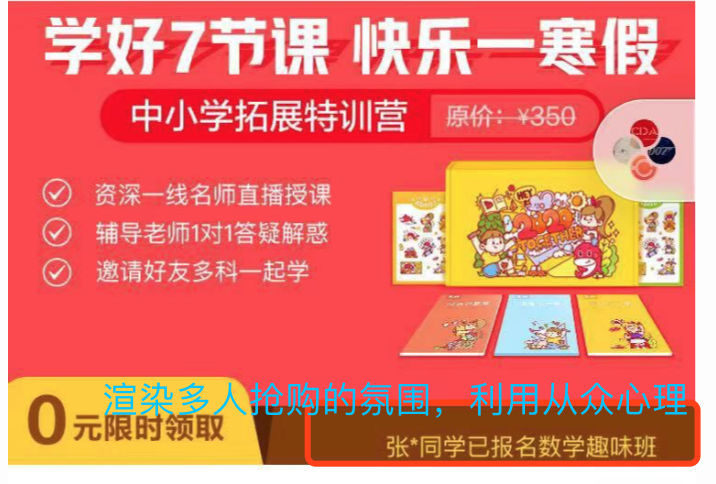 海報(bào)設(shè)計(jì)比較粗糙,唯一亮點(diǎn)是采用了【數(shù)字表達(dá)法】,清晰傳遞利益點(diǎn):0元學(xué)7節(jié)課程,量化課程內(nèi)容和打磨過程,凸顯課程價(jià)值,有助于用戶形成記憶,口口相傳。