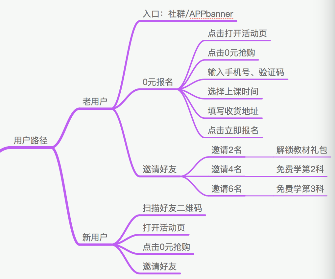 用戶路徑分析分為老用戶和新用戶流程,主要差異在于活動觸發(fā)方式不同,老用戶主要從APP內(nèi)的彈窗、運(yùn)營位、公眾號推文、社群助教推送鏈接接觸到該活動;新用戶主要通過老用戶分享的海報(bào)掃碼參與。