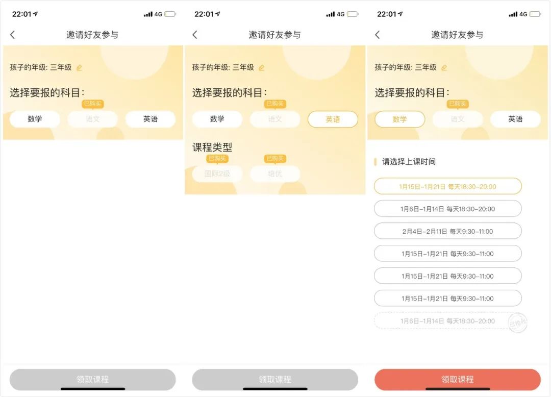 在選擇科目和課程時(shí)會標(biāo)記你已購買的課程,避免用戶重復(fù)領(lǐng)取同一節(jié)課