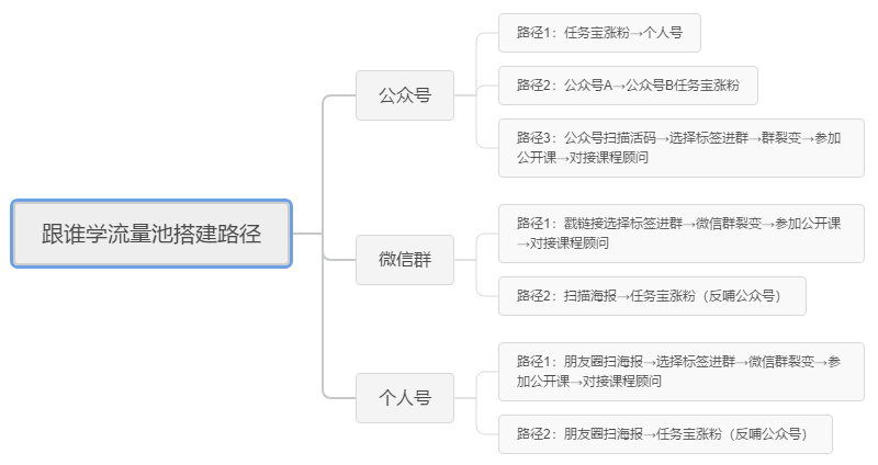 引流活動是跟誰學(xué)整個流量池搭建的發(fā)動機,有吸引力的活動配合有效的活動流程和系統(tǒng)工具最終才有跟誰學(xué)現(xiàn)在上千萬級的流量池,包括在微信紅利期起來的公眾號矩陣、微信群矩陣、個人號。 他們現(xiàn)在整套的運營策略是這樣的:利用現(xiàn)有的存量找增量,比如策劃有吸引力的活動投放到公眾號矩陣、社群矩陣、個人號朋友圈存量池子中做裂變增粉,通過高頻次、有吸引力的活動推動他們不斷擴大自己的私域流量池子,然后通過高品質(zhì)、高頻次的免費公開課吸引精準(zhǔn)流量,最后引導(dǎo)購買正價課程。 圖1-私域流量池搭建路徑