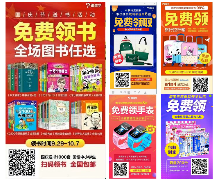 所以回歸今天案例拆解的主題,跟誰學(xué)是怎么設(shè)計有吸引力的活動的呢?有哪些亮點值得我們借鑒呢? 翻閱了跟誰學(xué)2月份到現(xiàn)在做過的引流活動,大概可以總結(jié)為兩大塊: 1.任務(wù)寶漲粉活動 通過書籍、資料、兒童玩具、拉桿箱、兒童手表等利益作為誘餌,讓用戶通過分享助力,領(lǐng)取禮品,我們獲得粉絲關(guān)注。 整個活動能否傳播開來,最關(guān)鍵的是選擇的誘餌是否能激發(fā)用戶分享的欲望和分享的海報是否吸引用戶的目光進行點擊,大概總結(jié)下跟誰學(xué)的誘餌選擇和海報設(shè)計特點如下: 圖3-部分任務(wù)寶裂變海報圖片