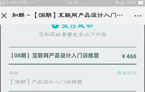 特別是支付完成后,跳轉(zhuǎn)出的課程列表顯示課程仍是468元的小設(shè)計(jì),這個(gè)小細(xì)節(jié)能讓用戶真切感受到課程的超值(就像明明花了1000元,但你只需要我給10元)。