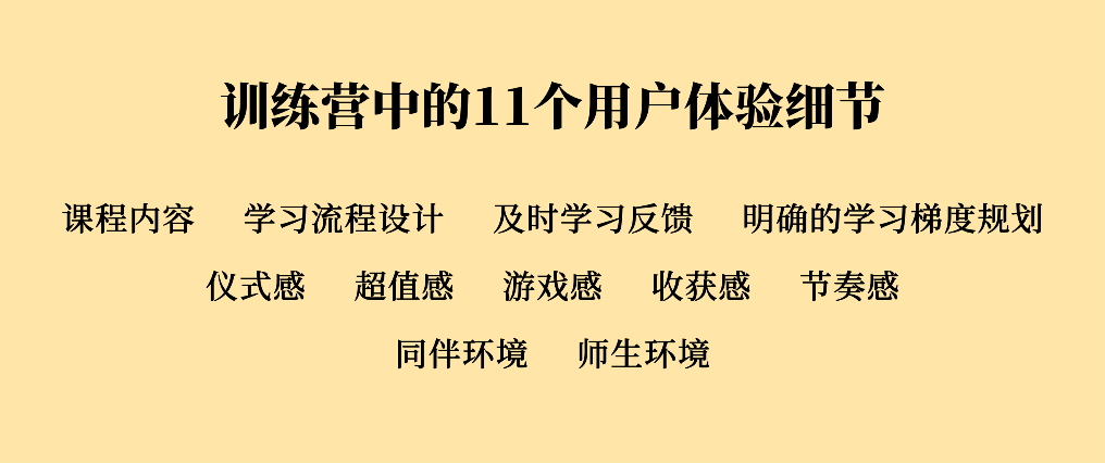 用戶體驗(yàn)細(xì)節(jié)這方面,之前木公子提出了影響訓(xùn)練營用戶體驗(yàn)的11個(gè)要素,引用一下,就不贅述了詳細(xì)內(nèi)容可搜文章看: