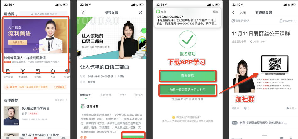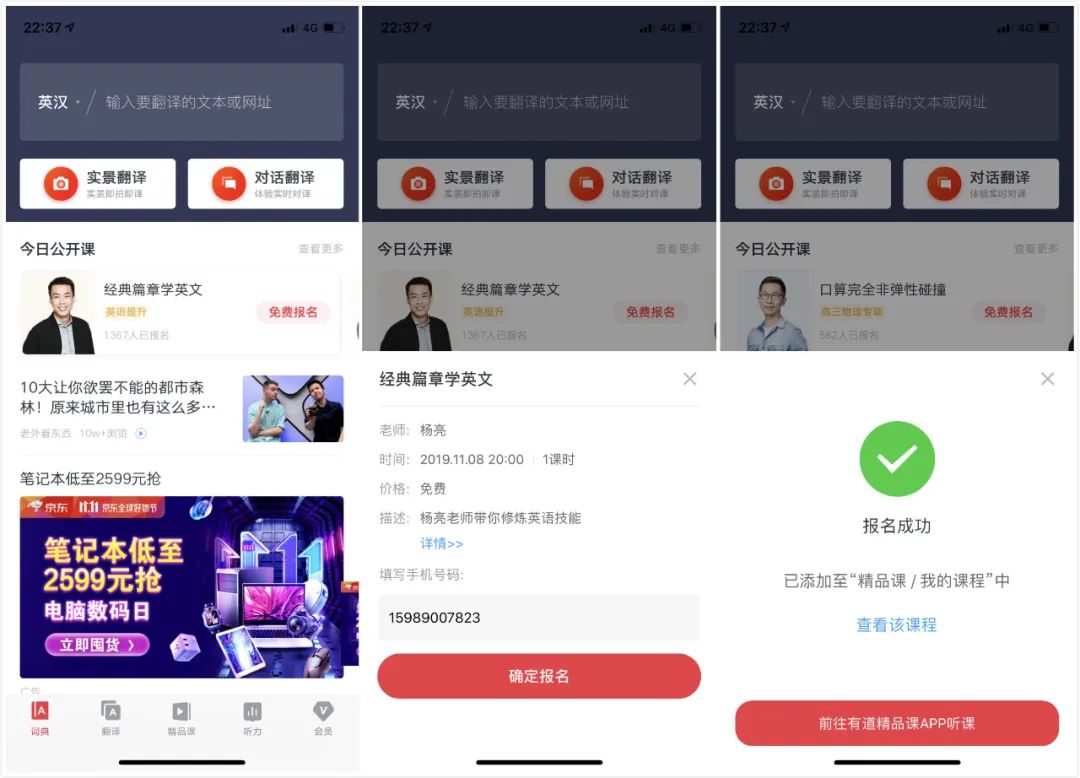 (1)學(xué)習(xí)App導(dǎo)流到有道精品課:基于學(xué)習(xí)場景展示免費公開課,吸引用戶點擊報名,報名成功后引導(dǎo)用戶下載有道精品課App去學(xué)習(xí)