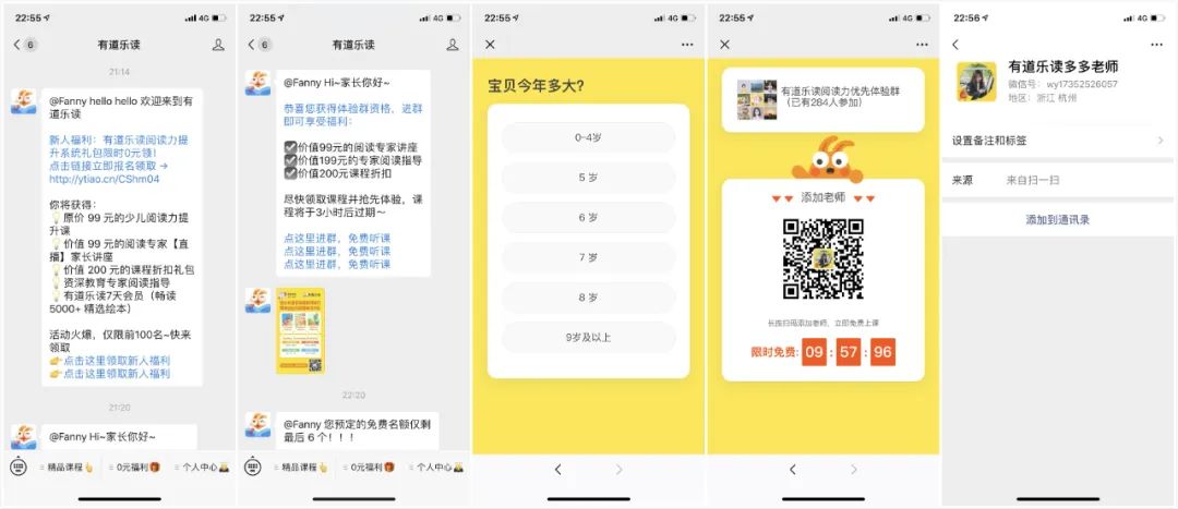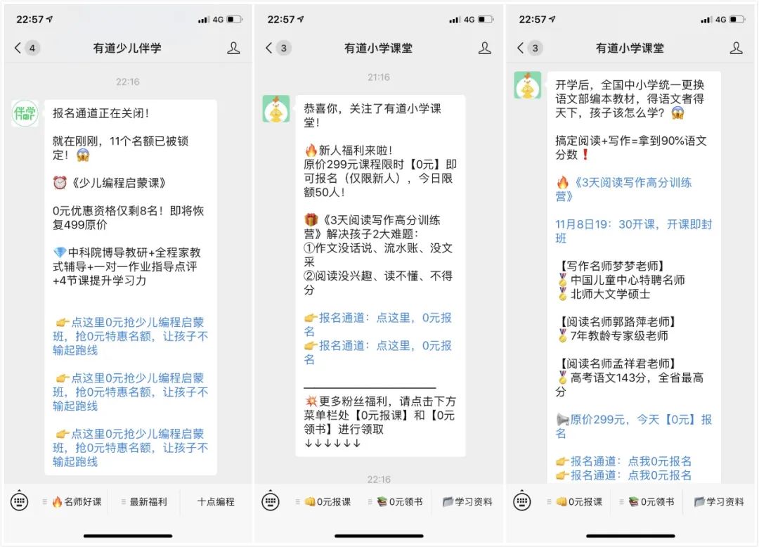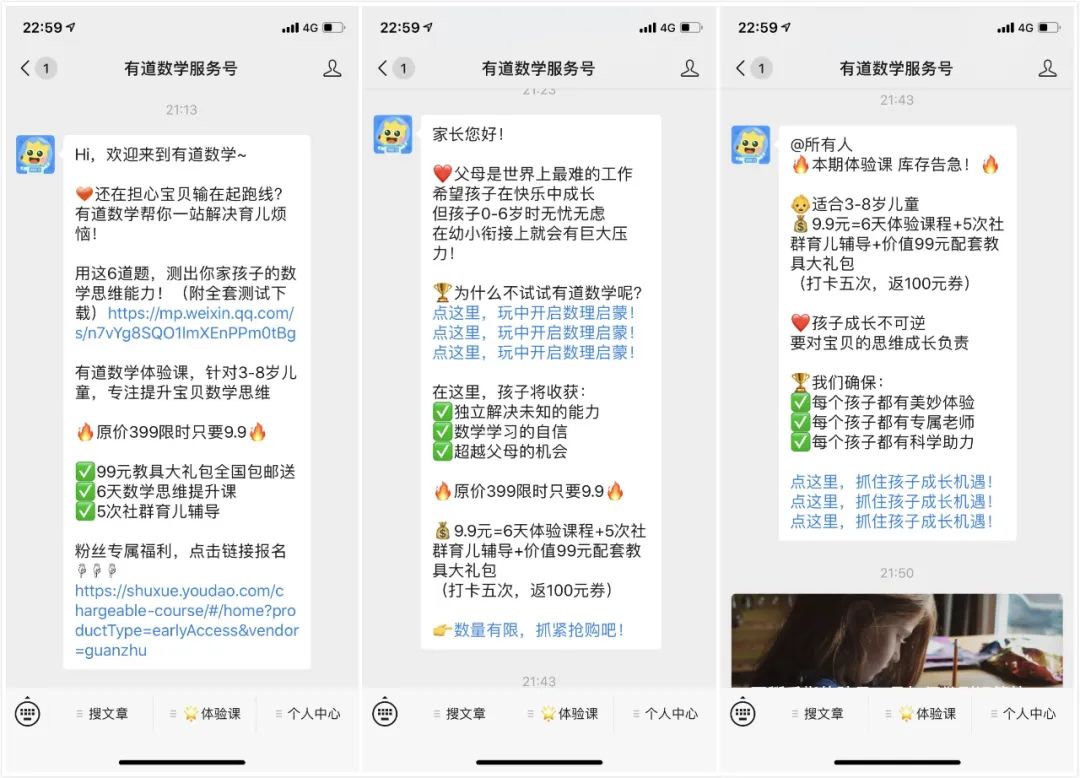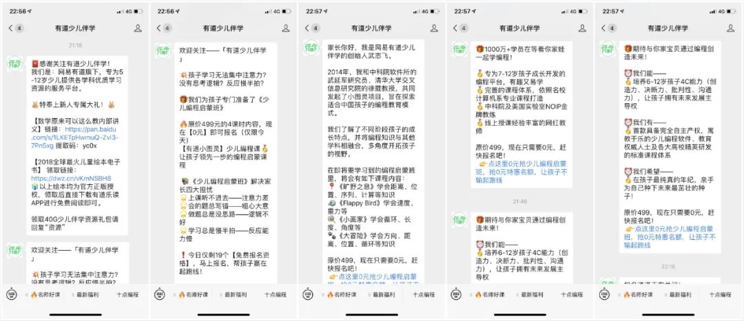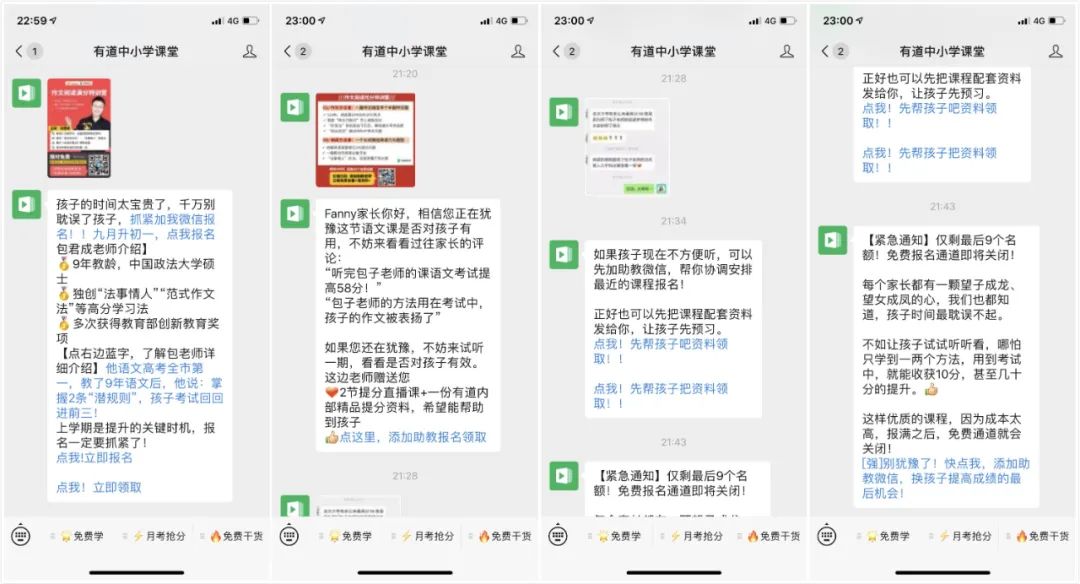 但其實關(guān)注公眾號后24小時內(nèi)可以推送客服消息,不設(shè)上限,有道充分利用了公眾號這條規(guī)則,在用戶關(guān)注第一個小時內(nèi)不停push,促使用戶快速決策轉(zhuǎn)化。但是過度打擾用戶可能適得其反,會有取關(guān)的風(fēng)險,話術(shù)的設(shè)計至關(guān)重要。有道值得借鑒的是善于使用第一人稱,以助教、老師、創(chuàng)始人的身份,與粉絲對話,拉近和粉絲的距離。