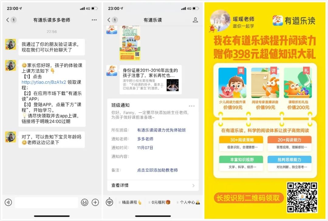 初次關(guān)注重點通過利益引導(dǎo)進(jìn)一步轉(zhuǎn)化,比如免費學(xué)習(xí)資料、0元領(lǐng)取課程。公眾號在這個產(chǎn)品生態(tài)里面有點像線下門店,客戶通過線上海報(=線下傳單)進(jìn)入公眾號(=線下門店),助教(=門店客服)跟客戶介紹產(chǎn)品并送了一節(jié)免費課(贈品/試用品),客戶注冊(登記個人信息/加客服微信)。接受了小恩小惠的用戶對產(chǎn)品有了一定的認(rèn)知甚至好感,公眾號又通過免費課獲取了客戶聯(lián)系方式,從此故事就開始了,后續(xù)客服就可以維系客戶關(guān)系,跟進(jìn)學(xué)習(xí)進(jìn)度,再給客戶推送更多高價值付費課程。