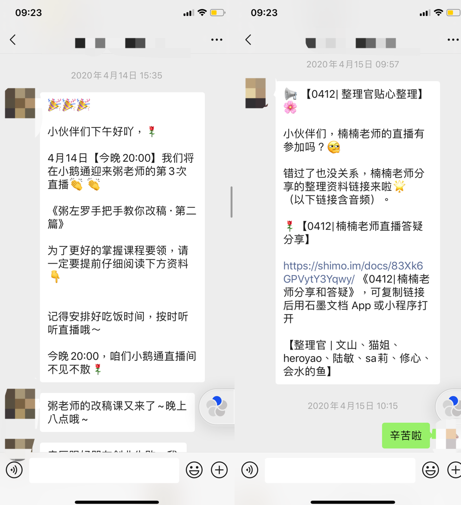 由于直播課程為音頻直播形式,因此每次都會有整理好的文字稿出來,放在群里以及私發(fā)給每個(gè)人。另外,在寫作下午茶鏈接里也會有更新。