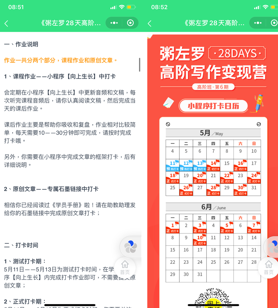 作業(yè)分為兩個(gè)部分,1是小程序打卡作業(yè),2是原創(chuàng)文章打卡作業(yè):你需要每2天完成一篇2000字以上的原創(chuàng)文章。