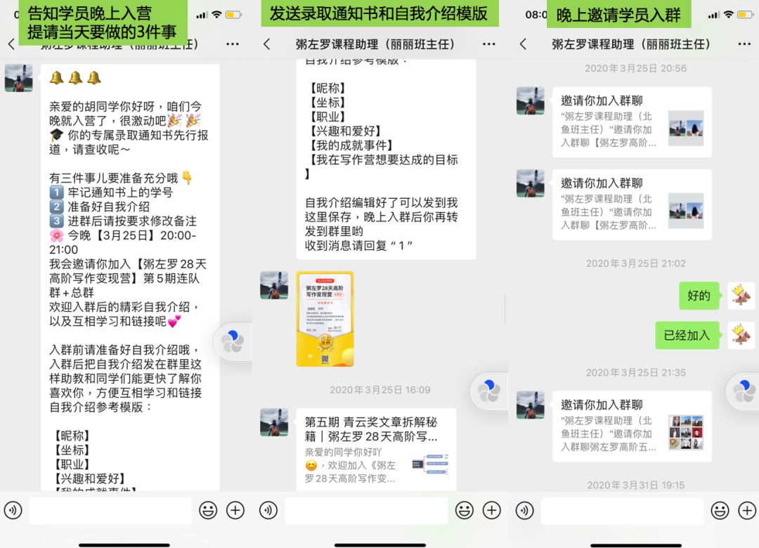 行動(dòng)上,班長會私發(fā)給學(xué)員必確認(rèn)的3件事(是否進(jìn)群、是否修改小程序昵稱,是否自我介紹),并確保學(xué)員回復(fù)完成。同時(shí)告知學(xué)員任何事情都可以找ta。助理也會私發(fā)學(xué)員了解學(xué)員寫作情況和頭條號鏈接。
