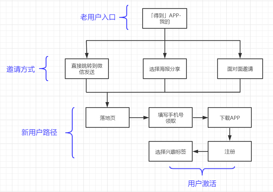 我們可以用AARRR模型來(lái)分析一下這里涉及的生命周期階段。首先這個(gè)活動(dòng)是促進(jìn)用戶推薦傳播,從而獲取用戶。這里其實(shí)就是老帶新,但是「得到」不止于此。