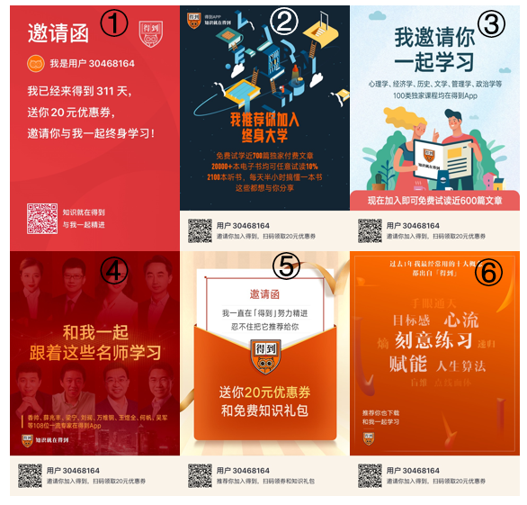 可選擇的海報(bào)一共有6張,可分為邀請(qǐng)函和海報(bào)兩種形式,主要應(yīng)用了海報(bào)要素中的信任背書與利益性。