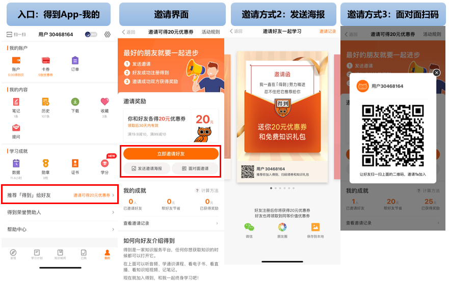 該案例規(guī)則是邀請(qǐng)好友注冊(cè)「得到」,雙方各得20元優(yōu)惠券,可重復(fù)參加。