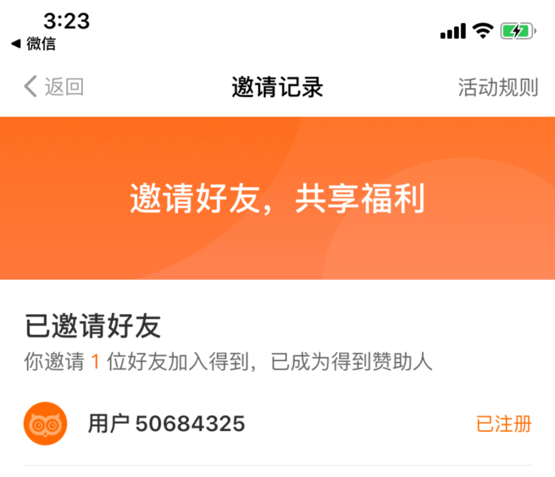 在邀請(qǐng)記錄中,只顯示好友昵稱與已注冊(cè),領(lǐng)取后若未注冊(cè)則不顯示。這更像是一個(gè)成果展示,但是可以進(jìn)一步優(yōu)化為分享動(dòng)力。